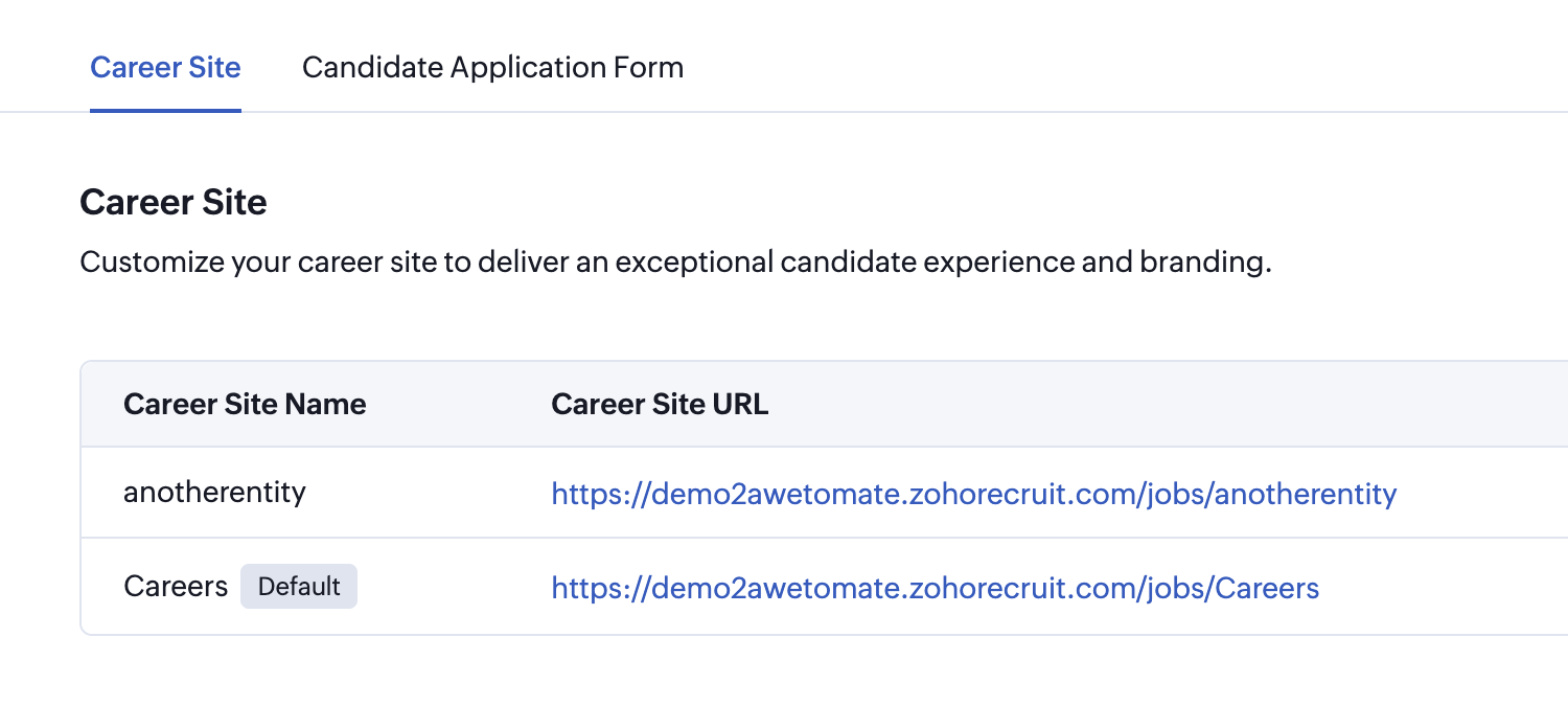 The domain for each careersite will be jobs.yourdomain.com/jobs/entity