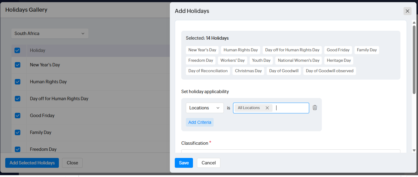 Drop down to South Africa > Add Selected holidays > Select Location (not shift) and classification