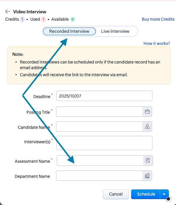 Schedule an interview for the relevant candidate > Select Video Interview > Recorded Interview. You will add the assessment you created here.